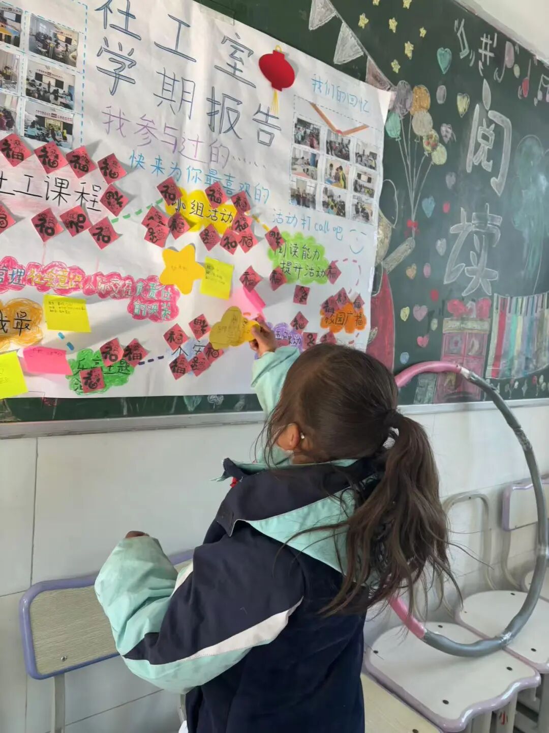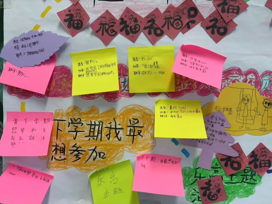 经过社工简单的回顾以及讲解后,学生们踊跃上前在自己参与过的活动下面贴上“新年福字”和“小红花”,并写下下学期想继续参加的活动。在分享环节,学生们纷纷表达了对本学期社工活动的深刻感受。有的学生提到,通过参与社工课程,他们学会了如何更好地管理情绪,提高了人际交往能力;有的学生则表示,小组活动和校园广播让他们感受到了团队合作的力量,收获了珍贵的友谊;还有的学生对个案辅导表示感激,认为它帮助他们解决了内心的困惑,找到了成长的方向。对于下学期的期待,学生们同样满怀热情。有的学生希望继续参与乐高创意工坊,探索更多创意的可能性;有的同学则期待在心语触动交流活动中,与更多同学分享彼此的故事,加深相互的理解与共鸣;还有的同学表示,他们希望下学期能有更多机会参与个案辅导,获得更加个性化的成长支持。